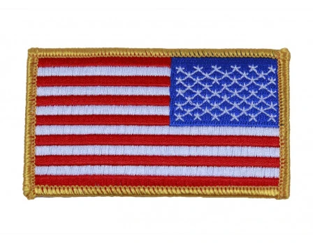 Embroidered United States flag patch for referee or umpire uniforms – generally for use on right sleeve- is 3.5″ by 2.25″. Choose American flag with white or gold border.